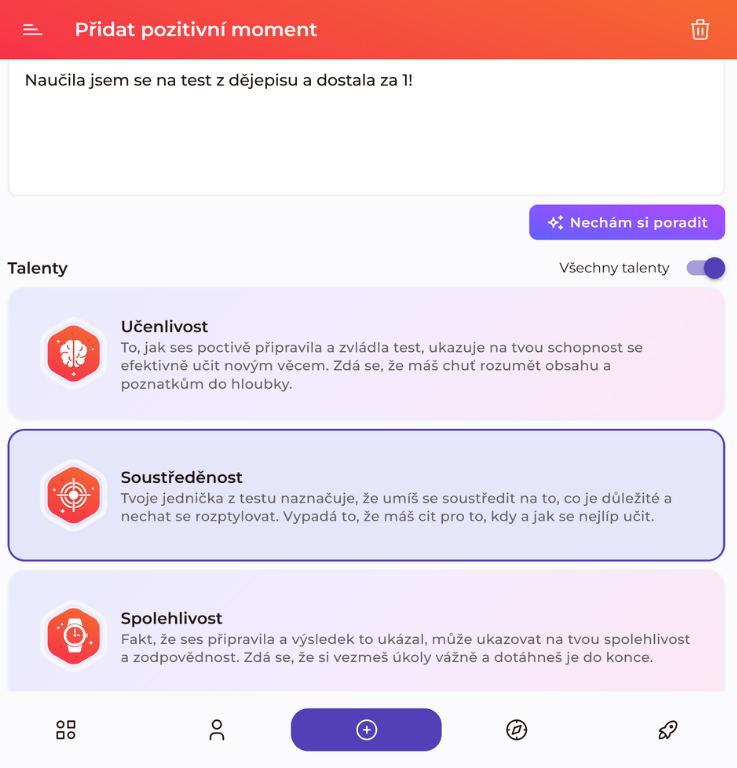 Velká novinka, na které jsme v posledních měsících v Salmondu pracovali, je konečně tady. Žáci si nyní mohou do aplikace průběžně zapisovat, co se jim daří, a propojovat tyto zkušenosti se svými talenty.